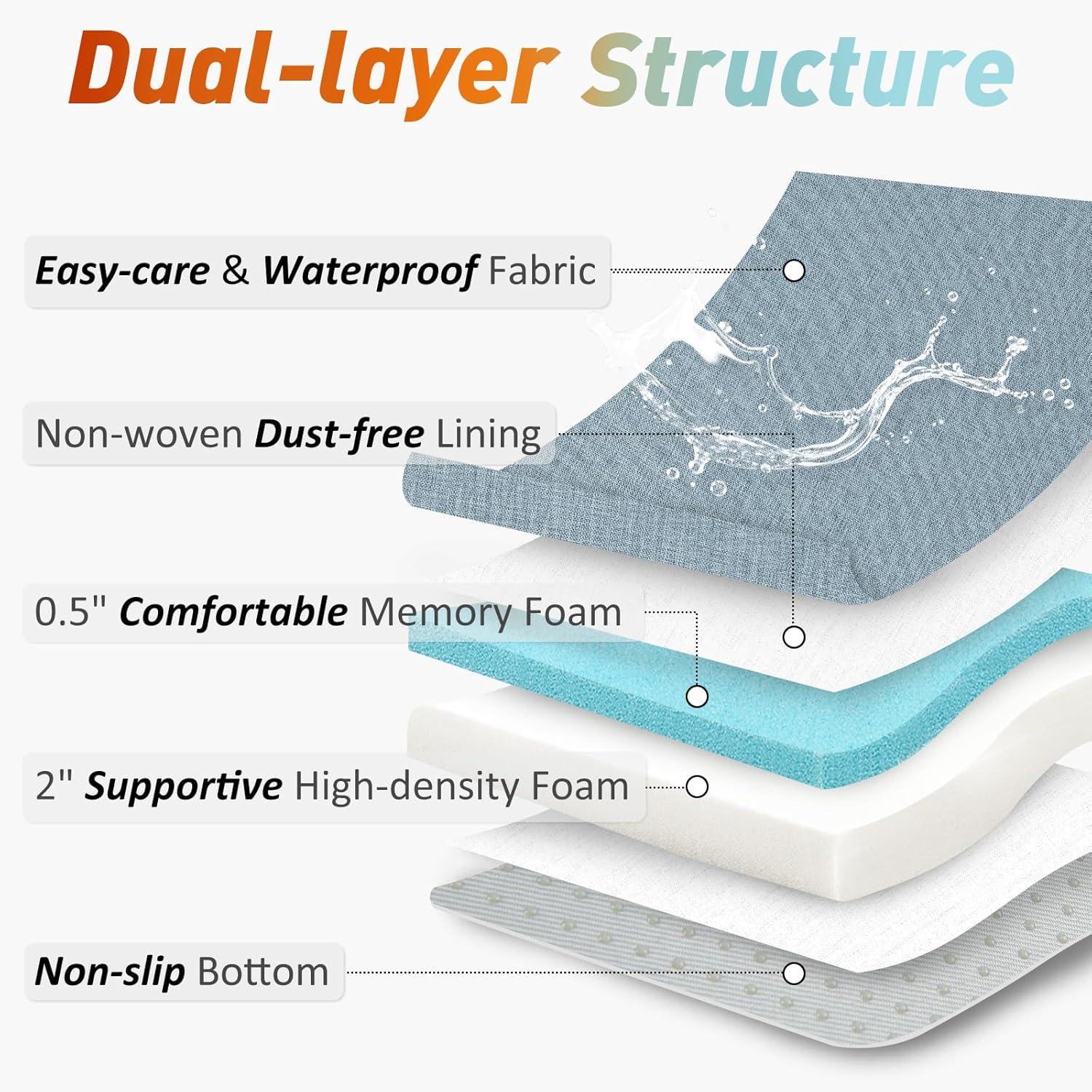 Double Layer Foam: The downluxe chair cushion molds to your shape with 0.5″ of memory foam over a 2″ high-density foam base. It's made to ease pressure and keep you comfortably supported through long, laughter-filled dinners or quiet moments of relaxation