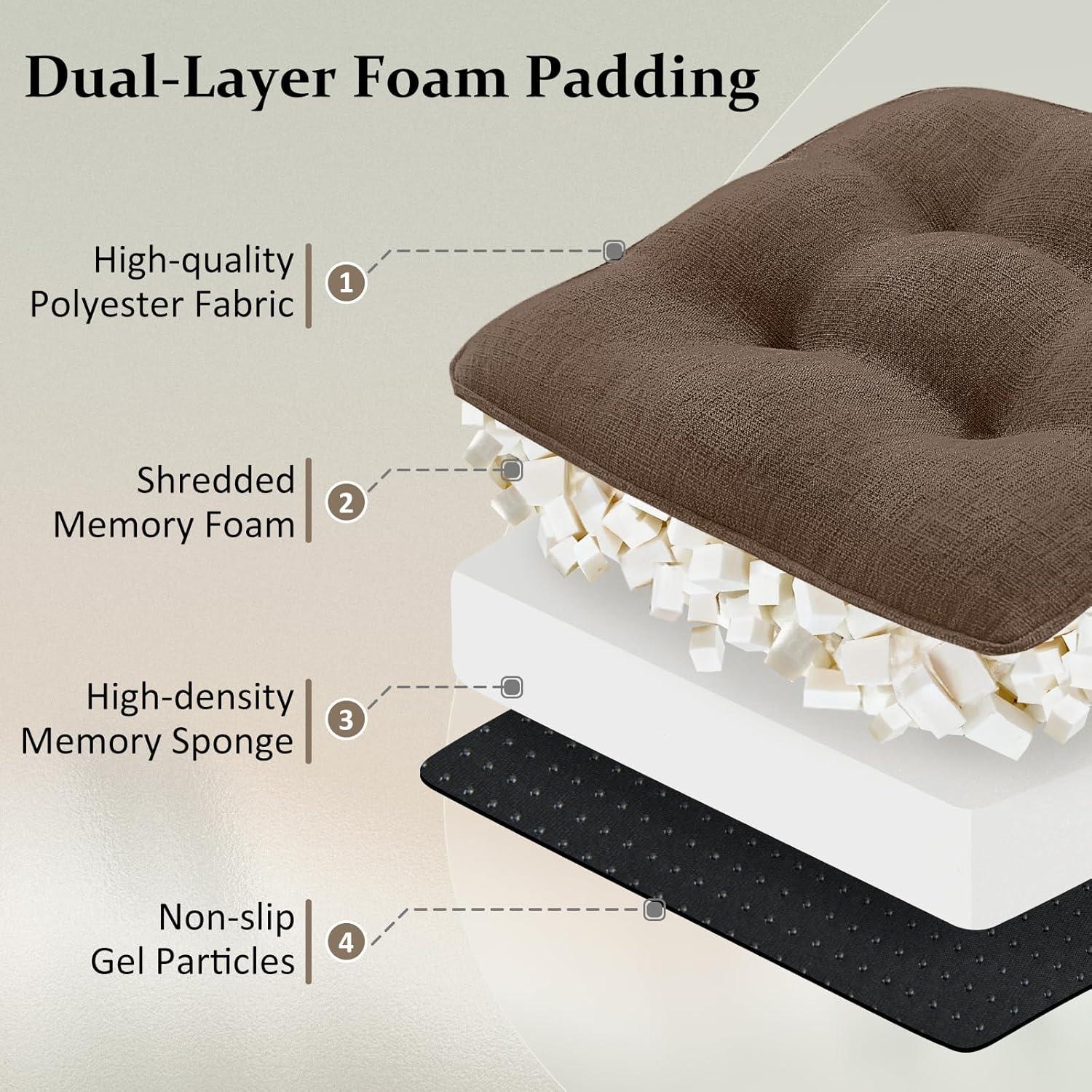 downluxe Chair Cushions for Dining Chairs with Ties, Non-Slip Memory Foam Kitchen Chair Cushions, Tufted Seat Cushions for Kitchen Chairs, Dual-Layer Chair Pads, 16.5” x 16.5” x 3”, Set of 4, Brown