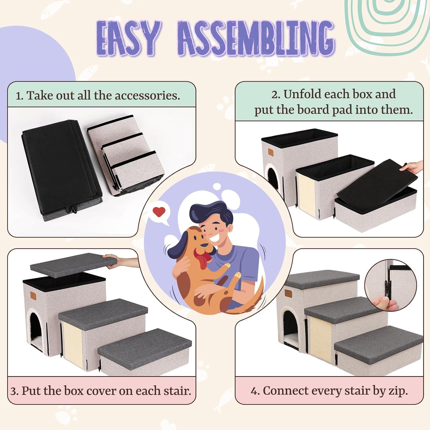 EASY ASSEMBLY: The dog stairs for high beds are simple to assemble with detailed instructions provided. These pet stairs for small dogs can also be easily folded flat to store, making it a convenient addition to your home