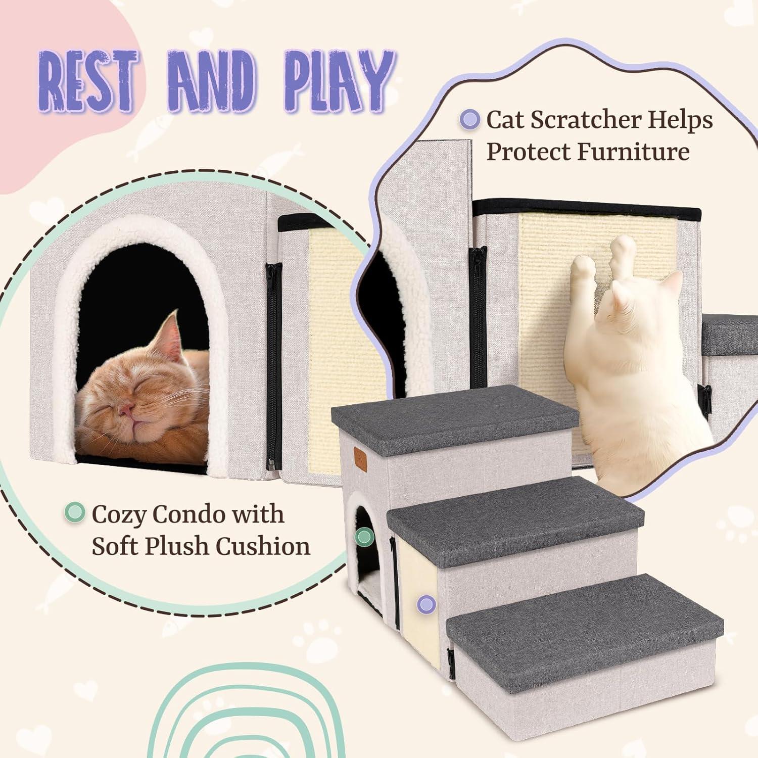 UNIQUE FEATURES: The condo for the highest stair of the dog steps for bed is designed with a furry door and a sherpa cushion. Special cat scratcher is decoratived to attract kittens' attention, helping your furniture far away from claw damage