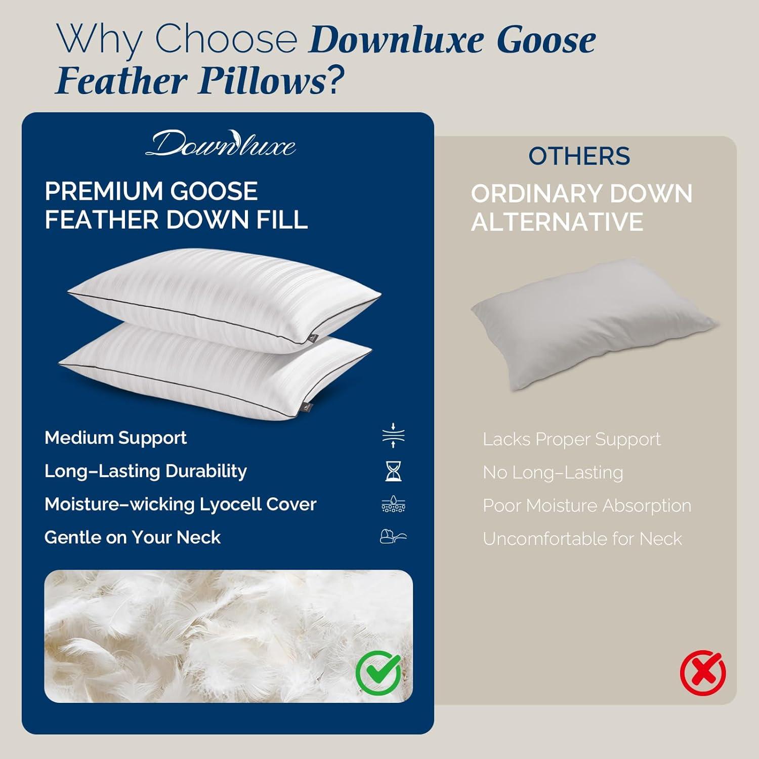 downluxe Goose Feather and Down Pillows – Hotel Collection Feather Pillows Set of 2 for Back, Stomach or Side Sleepers, Queen Size (20″x28″)(Gusseted Horizontal Stripes)