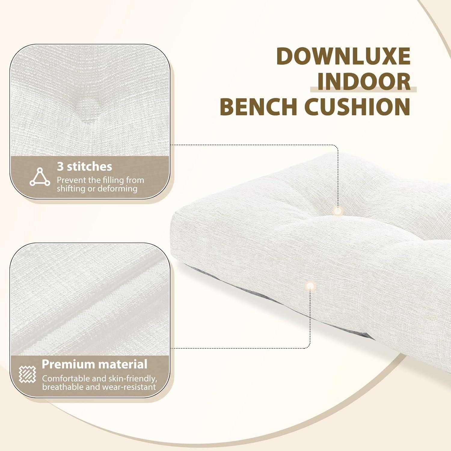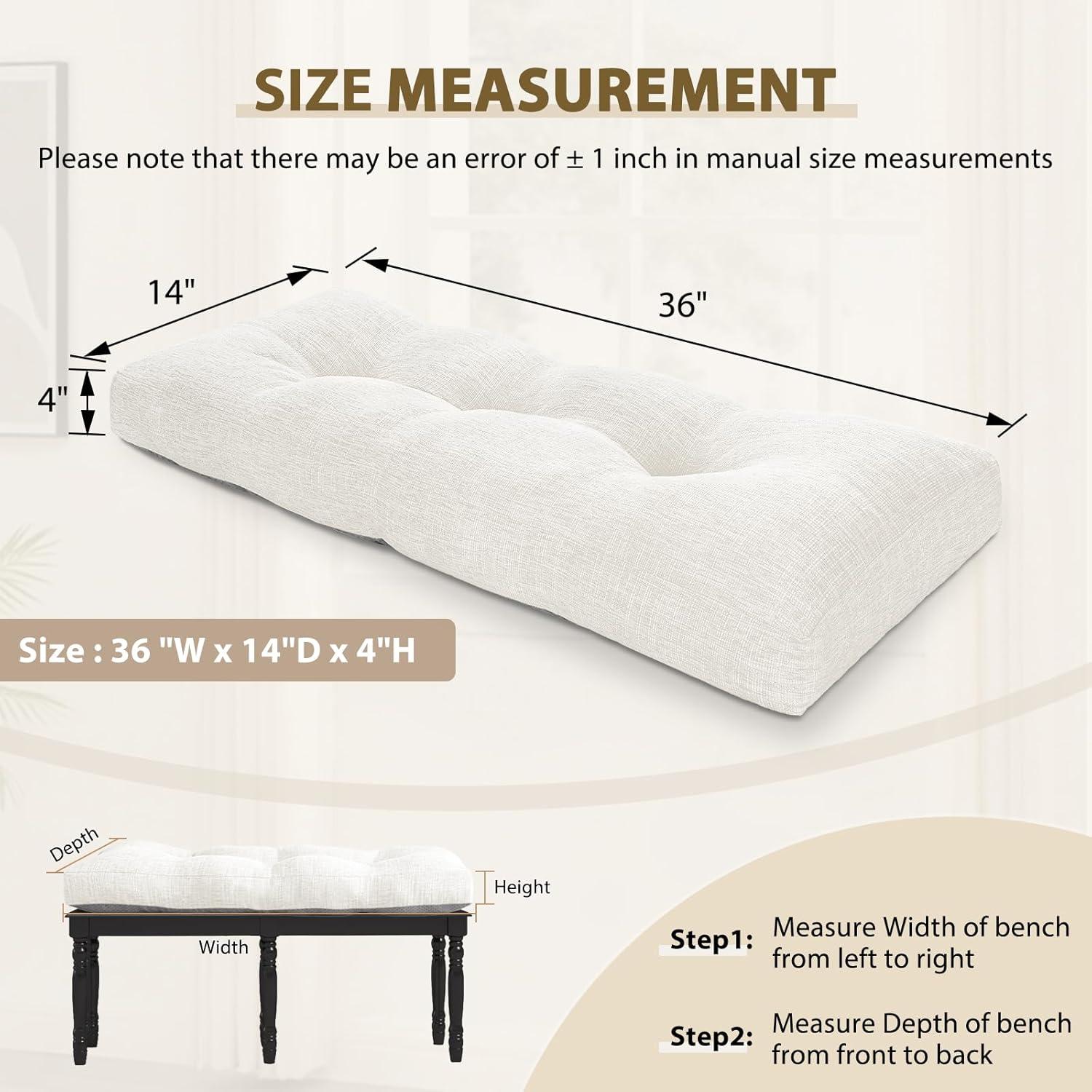 SIZE & PACKAGING: downluxe bench pillow cushion features a tufted design and measures 36″W x 14″D x 4″H. Please note: Due to long-term vacuum packaging during shipping, the cushion may appear smaller at first but will expand to its full size