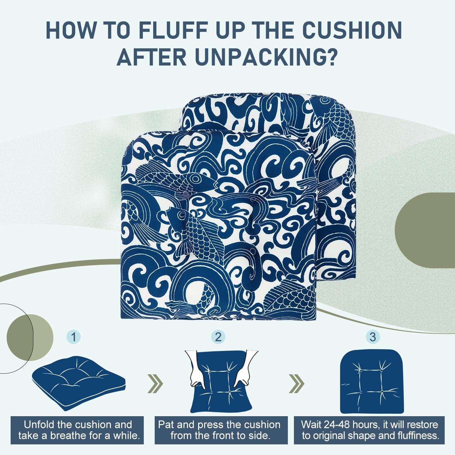 Size and Package: The size of the outdoor chair cushions is 19 X 19 X 5 inches and fits most standard size chairs. As the cushions are vacuum packed, you can press and tap them for a while after unpacking and they will restore fluffy within 24-48 hours