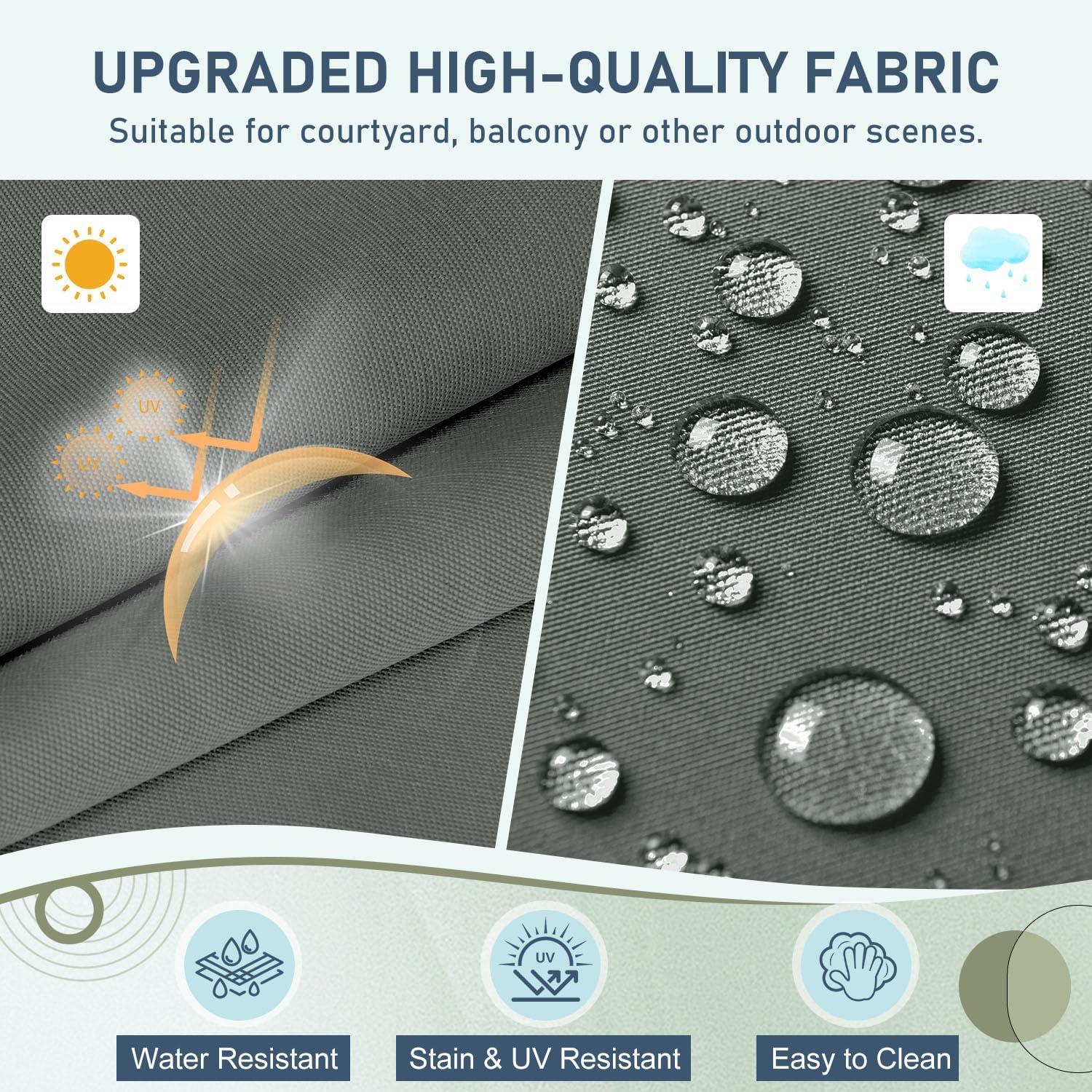 Premium Fabric: Outdoor cushions are made of polyester fabric which is water, stain and UV resistant. The fabric can withstand daily wear and tear, but it is recommended to bring them indoors when raining to preserve lifespan and maintain appearance