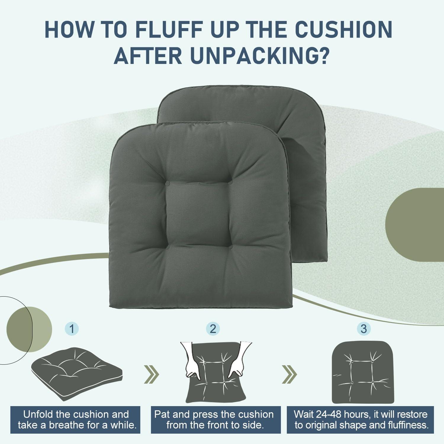Size and Package: The size of the outdoor chair cushions is 19 X 19 X 5 inches and fits most standard size chairs. As the cushions are vacuum packed, you can press and tap them for a while after unpacking and they will restore fluffy within 24-48 hours