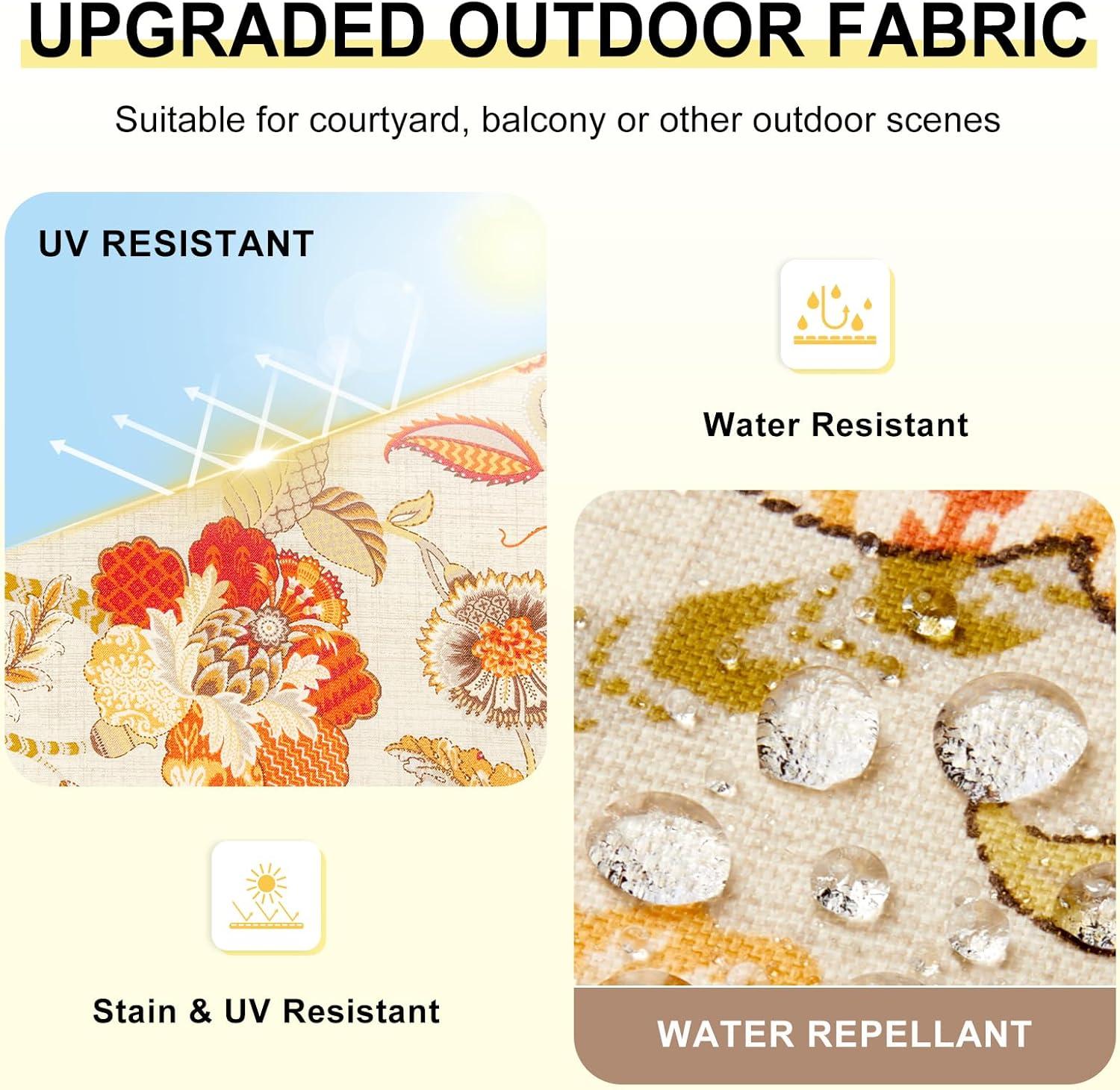 Premium Fabric: Outdoor cushions are made of polyester fabric which is water, stain and UV resistant. The fabric can withstand daily wear and tear, but it is recommended to bring them indoors when raining to preserve lifespan and maintain appearance
