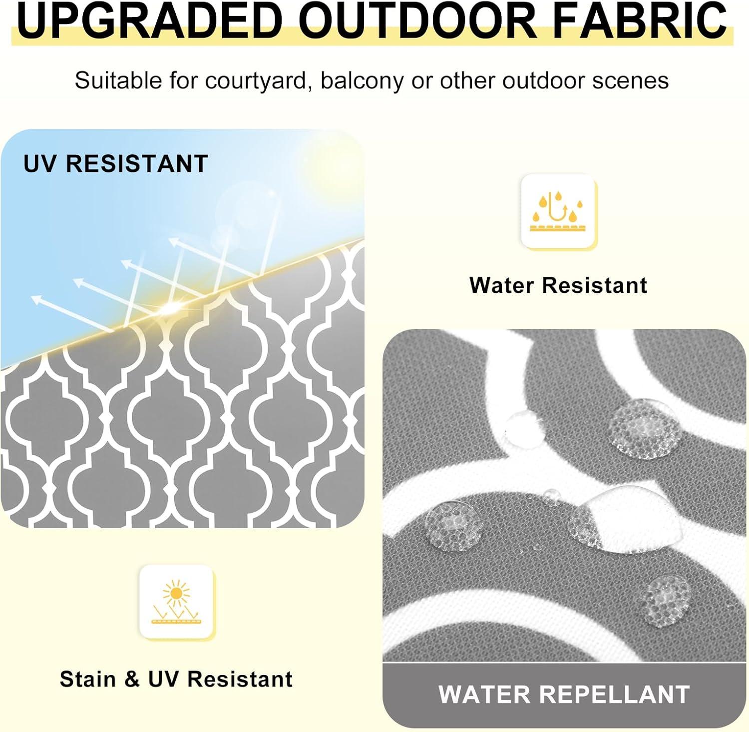 Premium Fabric: Outdoor cushions are made of polyester fabric which is water, stain and UV resistant. The fabric can withstand daily wear and tear, but it is recommended to bring them indoors when raining to preserve lifespan and maintain appearance