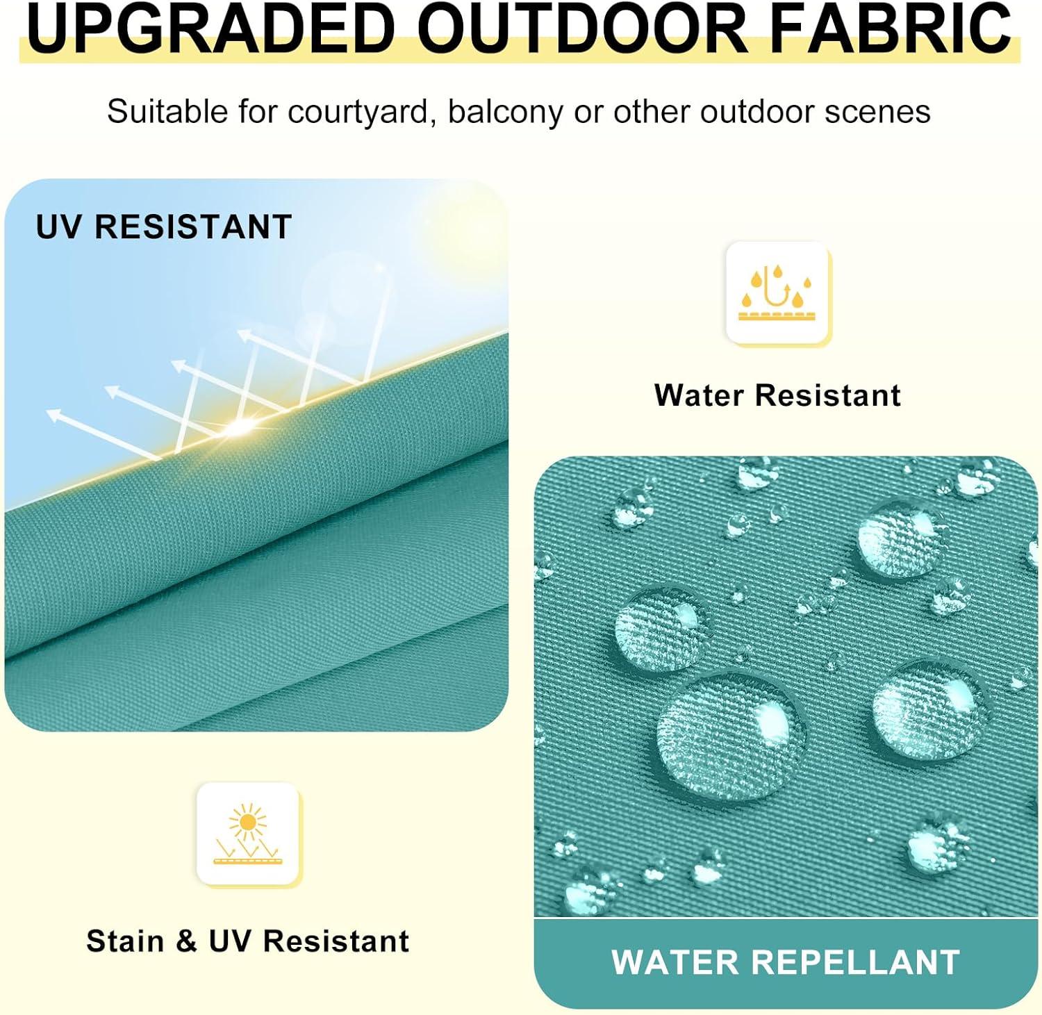Premium Fabric: Outdoor cushions are made of polyester fabric which is water, stain and UV resistant. The fabric can withstand daily wear and tear, but it is recommended to bring them indoors when raining to preserve lifespan and maintain appearance