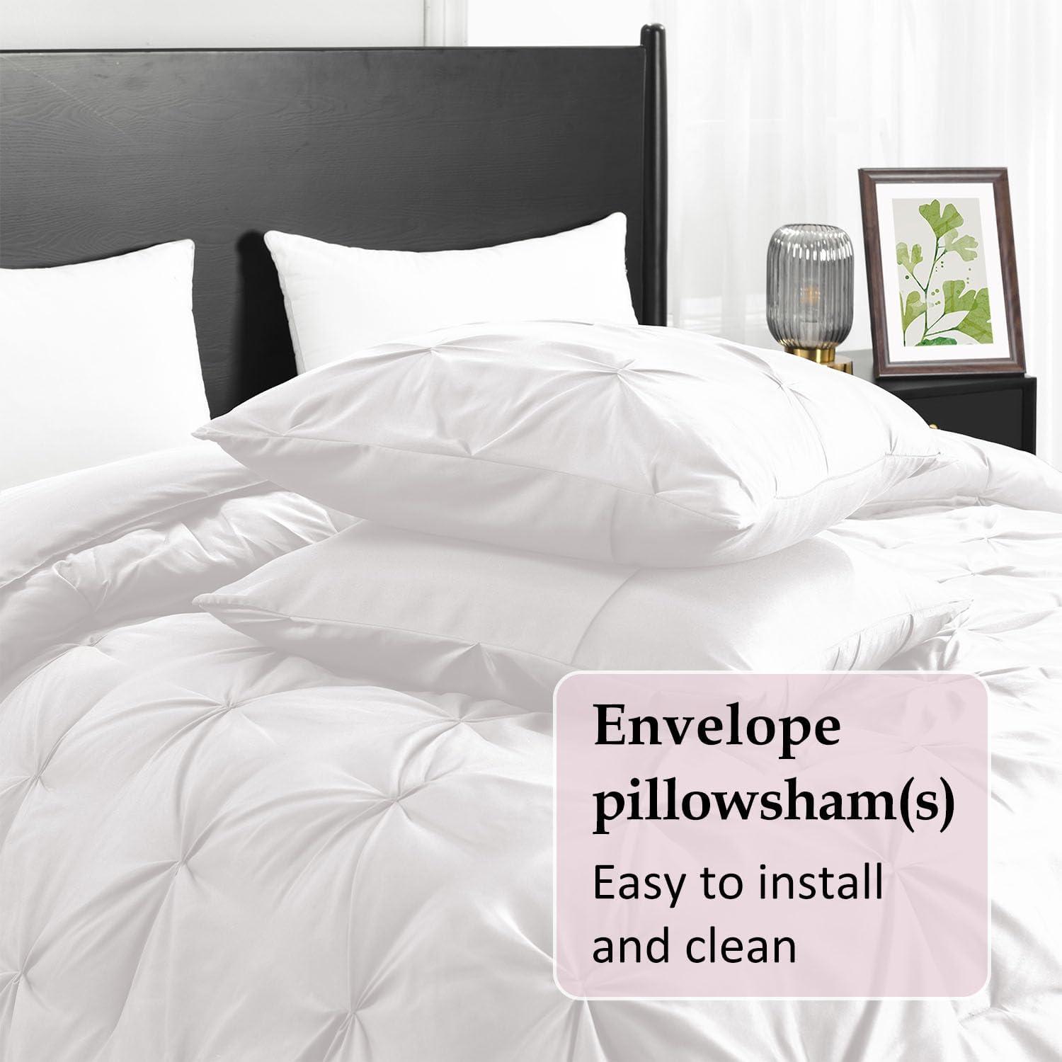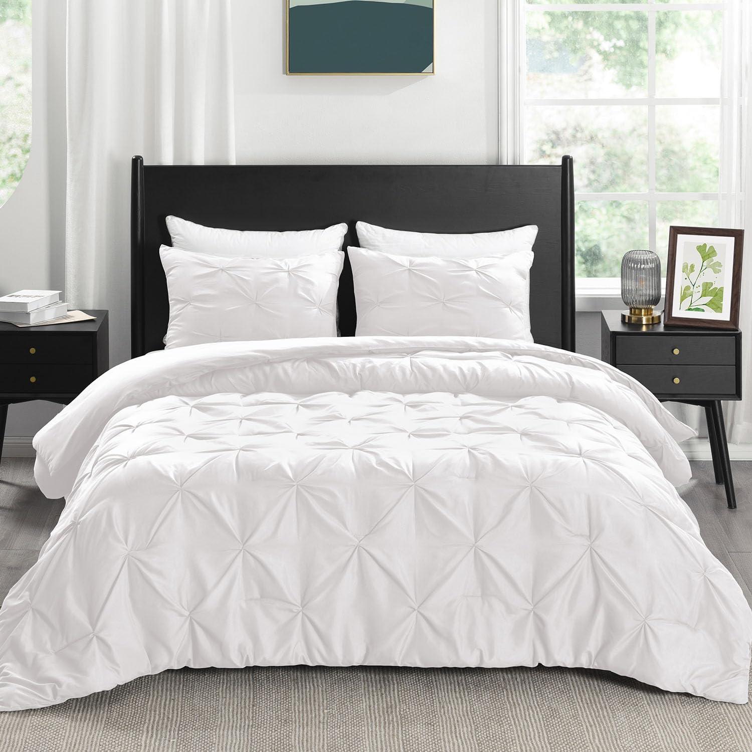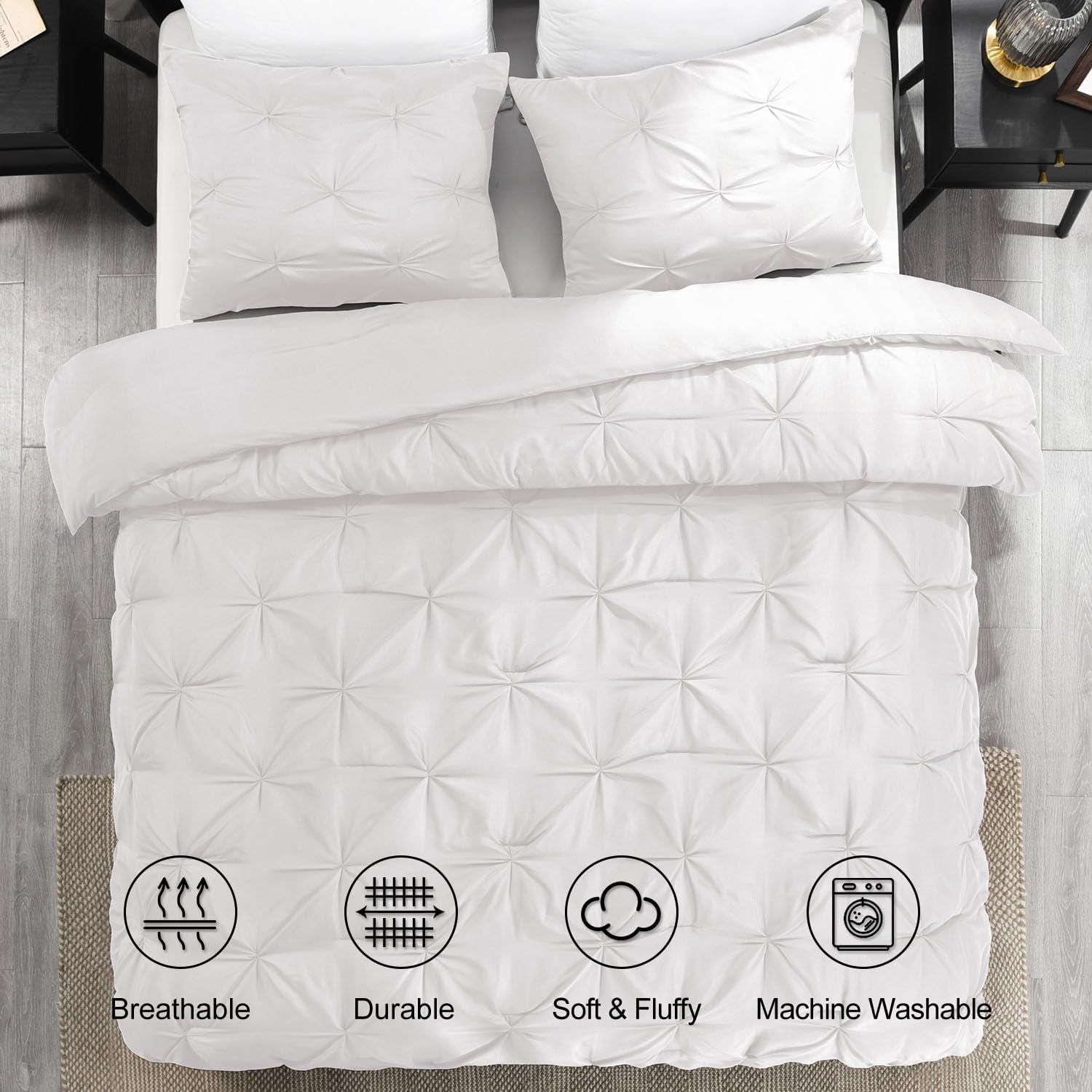 downluxe Pintuck Queen Comforter Set with 2 Pillow Shams – 3-Piece – White Queen Bed Comforter Set for All Seasons, Pinch Pleat Microfiber Down Alternative Bedding Comforter Sets