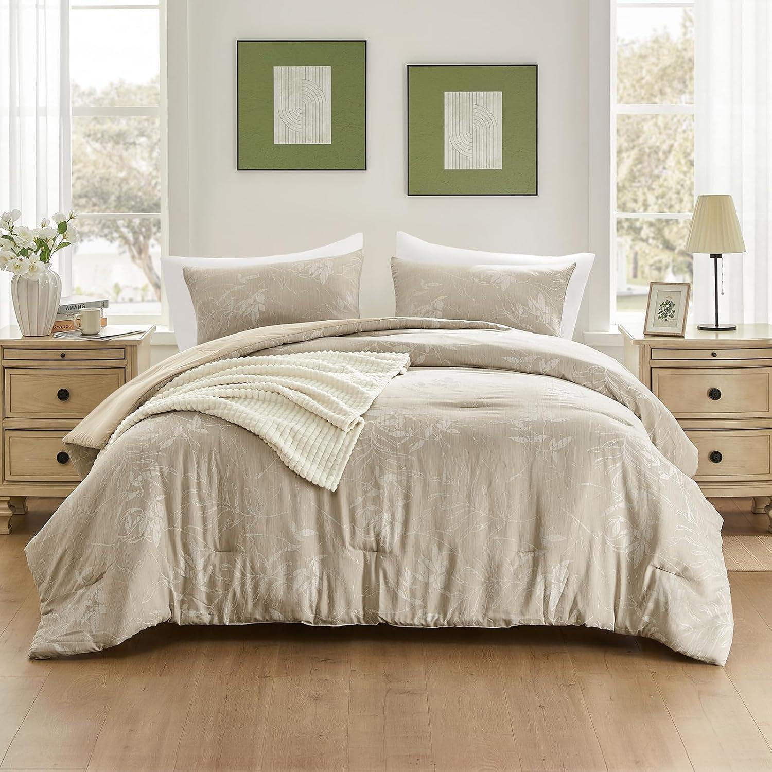 downluxe Queen Comforter Set - 3 Pieces Dark Green Bedding Comforter Sets, Queen Botanical Flower Comforter, 1 Soft Reversible Floral Comforter and 2 Pillow Shams for All Seasons(Khaki)