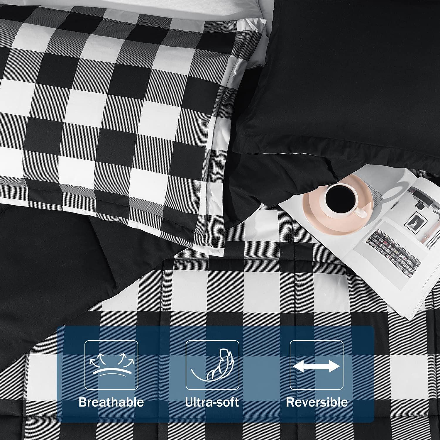 imagedownluxe Queen Comforter Set  Charcoal and Grey Queen Comforter Soft Bedding Sets for All Seasons 3 Pieces  1 Comforter 88quotx92quot and 2 Pillow Shams20quotx26quotPlaid BlackWhite