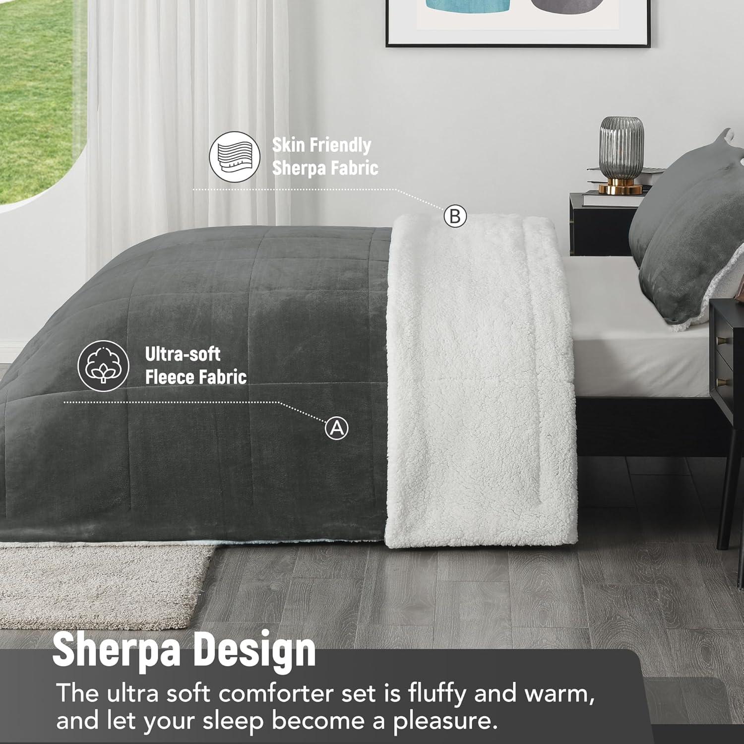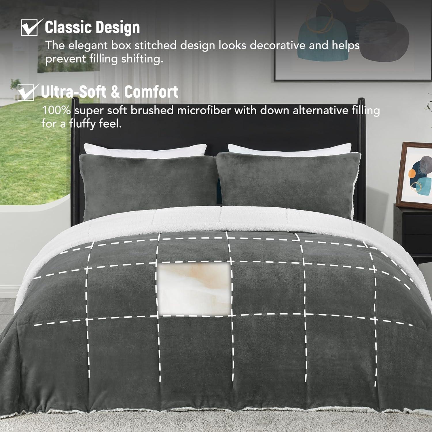 imagedownluxe UltraSoft Micromink Sherpa Queen Comforter Set with 2 Pillow Shams  3Piece Set  Dark Grey  Plush Warm Fall Winter Bedding Comforter SetsCypress