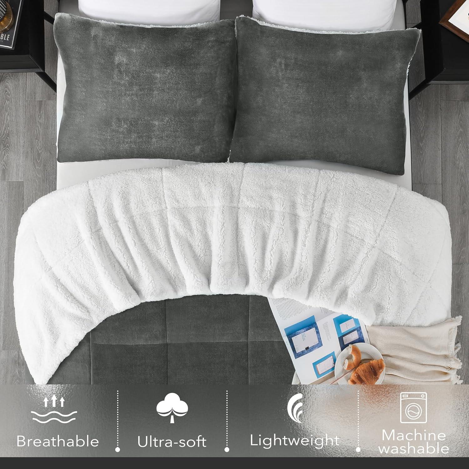 imagedownluxe UltraSoft Micromink Sherpa Queen Comforter Set with 2 Pillow Shams  3Piece Set  Dark Grey  Plush Warm Fall Winter Bedding Comforter SetsLight Grey