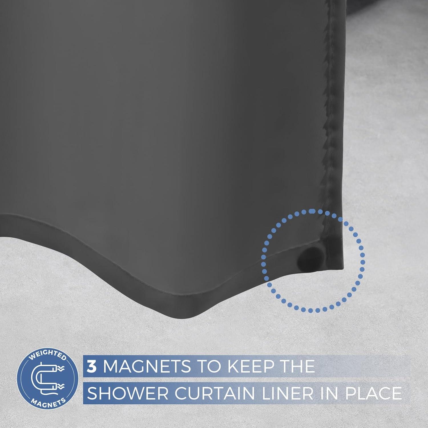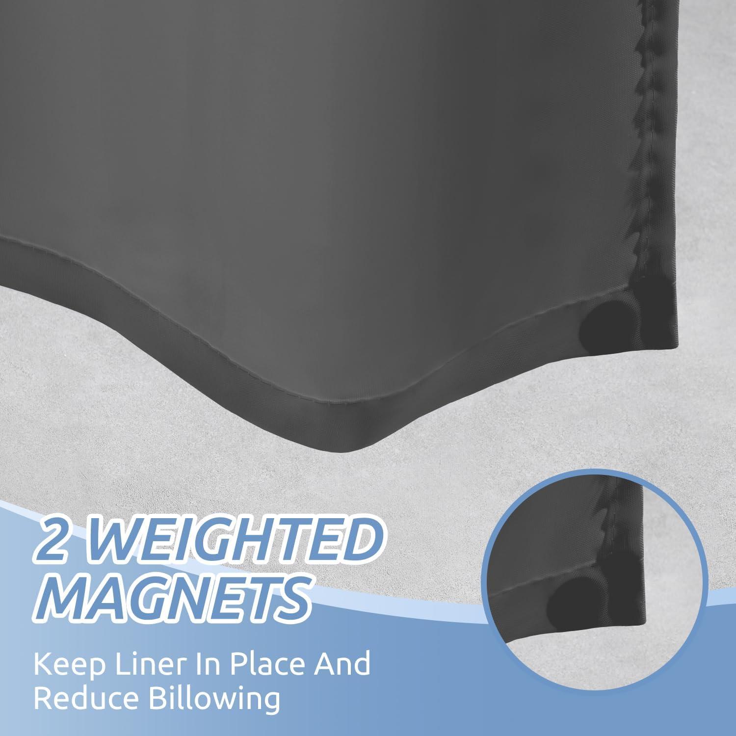 Weighted Bottom Hem: 3 weighted magnets at the bottom stick to the tub's side to keep the shower curtain liner in place and reduce blowing when you are showering