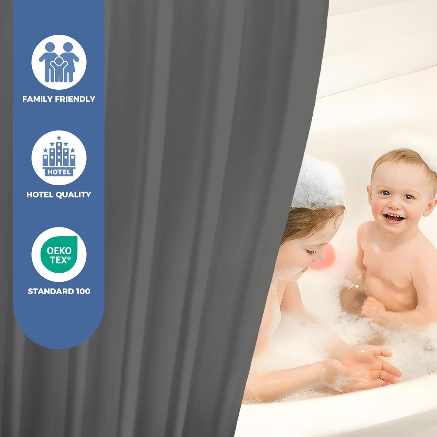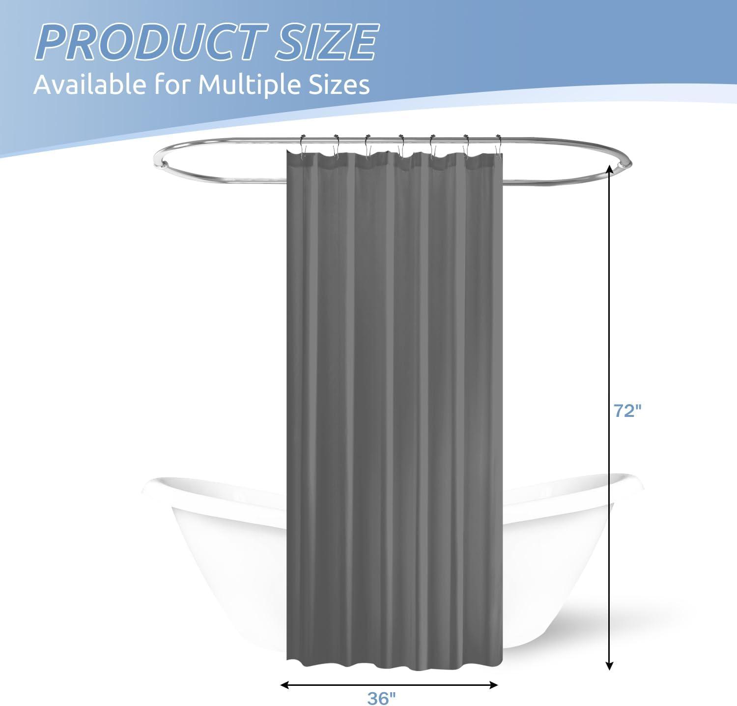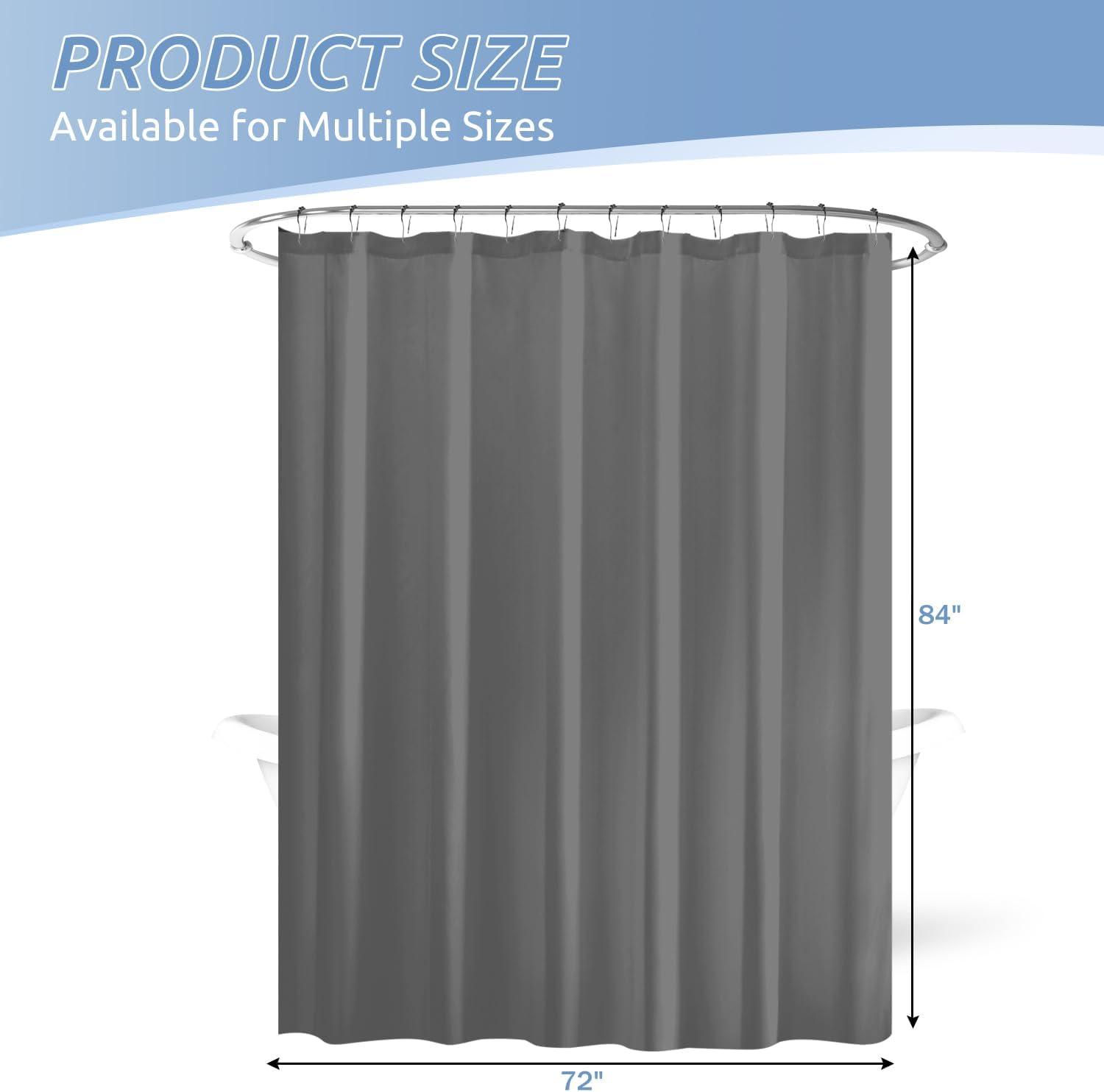 Standard Size: The size of the fabric shower curtain liner is 70″W x 72″L, ideal for most standard size showers and bathtubs. It works with straight or curved shower rods